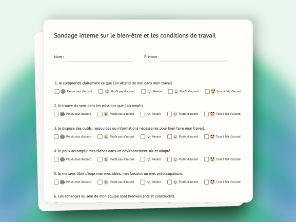 Écouter vos équipes, c’est poser les bonnes questions. Ce modèle gratuit de questionnaire QVT (Qualité de Vie au Travail), proposé au format PDF, vous aide à recueillir des retours concrets sur le quotidien de vos salarié·es.